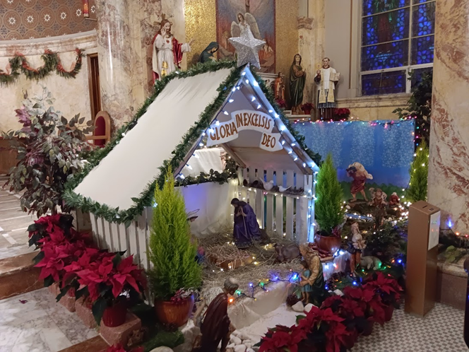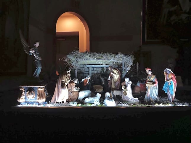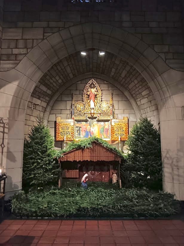 The Nativity scene sits to the right of the altar steps.