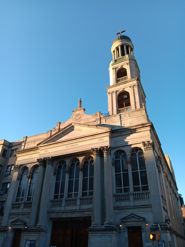 The Church of Our Lady of Pompeii can be reached by taking the B, D, F or M train to W. 4th Street and Washington Square.