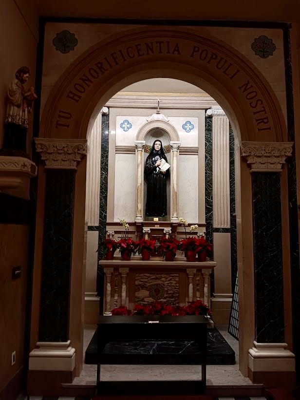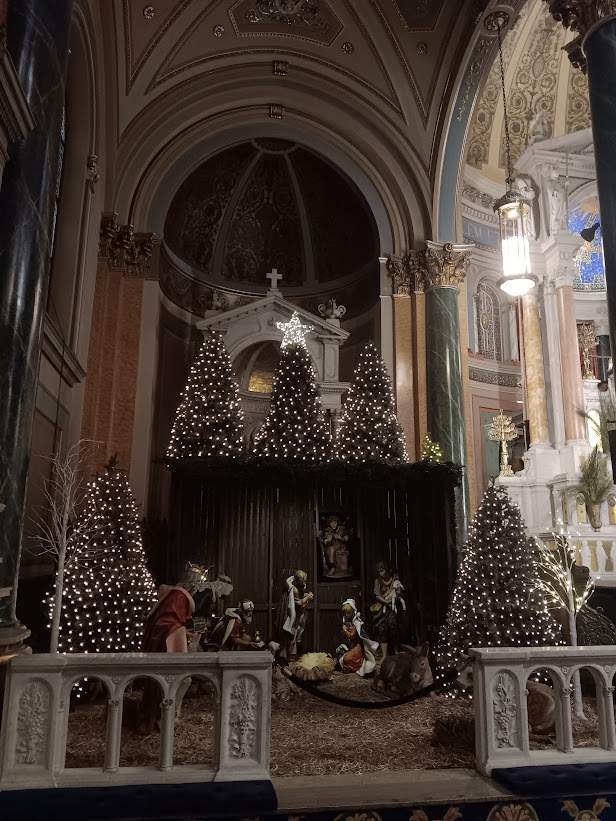 The church has numerous side altars and side chapels, one of which contains its Nativity scene.
