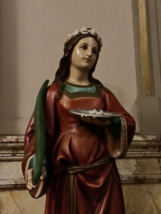 St. Lucy is a key saint in Italian and Swedish cultures, whose feast day on Dec. 13 is a major holiday. Your eyes aren’t deceiving you—those are a pair of eyeballs on the plate St. Lucy is holding!