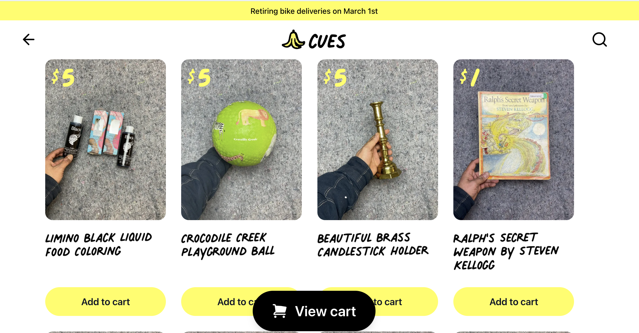 Cues jokes that its model is “slower than Amazon and less money than Facebook,” but thinks of itself as a “neighborhood warehouse.” The prices are set to move so they can rehome the goods, and keep stuff moving from their shelves.