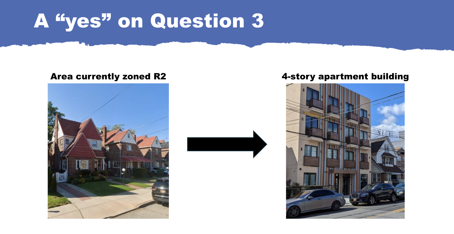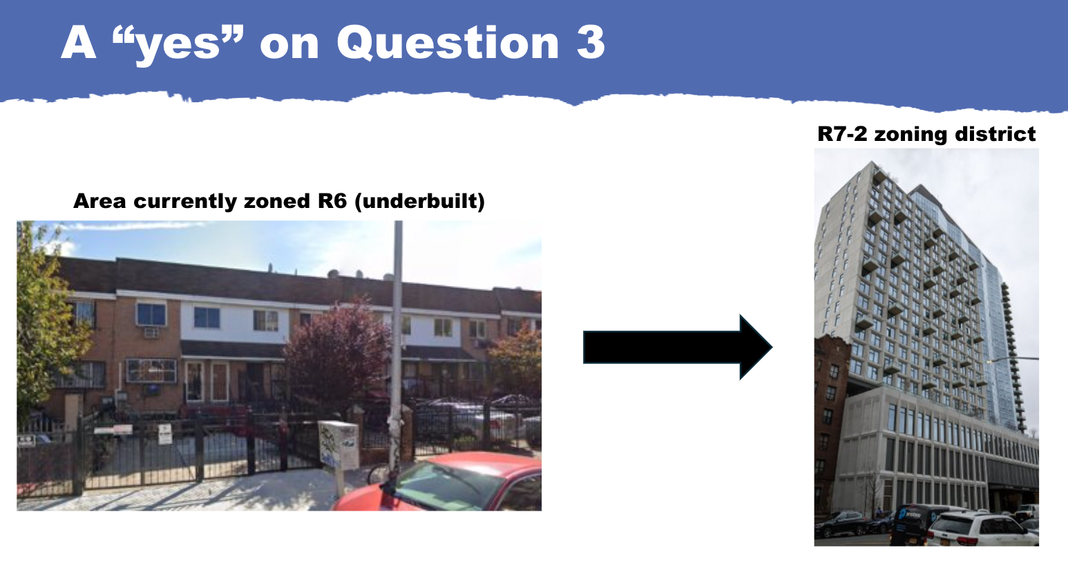 What’s swaying me is that Crain’s got a look at a presentation that the City Council is giving to community boards behind the scenes, and while a lot of it just goes over the usual slop about "neighborhood character" and "local control," some of it is simply unbelievable to me. Complaining that your own fair housing reports will actually have something to enforce the findings is wack as hell! And you tell me, do these pictures of possible futures if Question 3 passes scare you? Because they do not scare me.