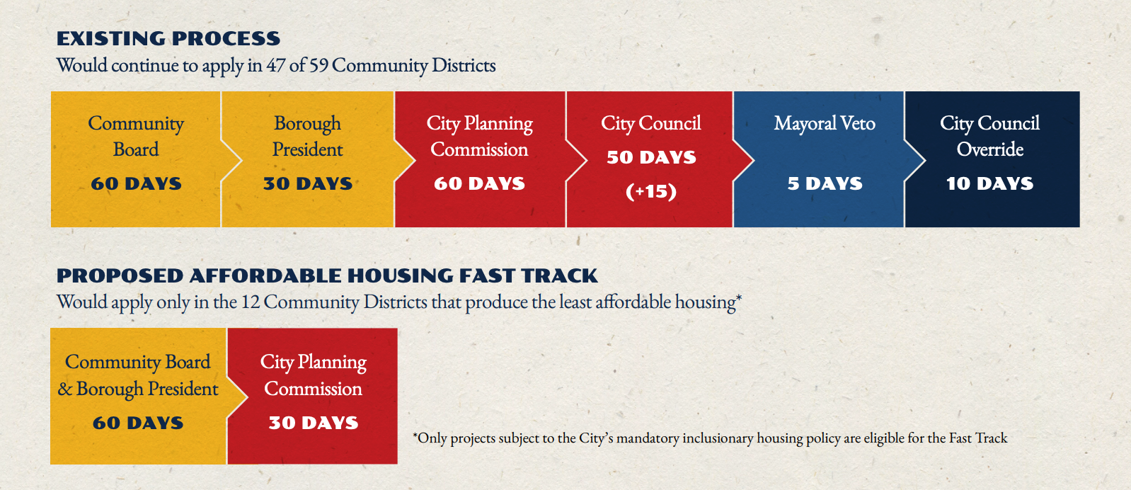 Ballot Question 3 replaces ULURP for “modest” housing proposals that include affordable housing with a new review process would speed up zoning changes for these smaller projects. Under this new process, the separate 60-day community board and 30-day borough president review periods would be combined into one 60-day review period, followed by a 30-day review by the City Planning Commission.