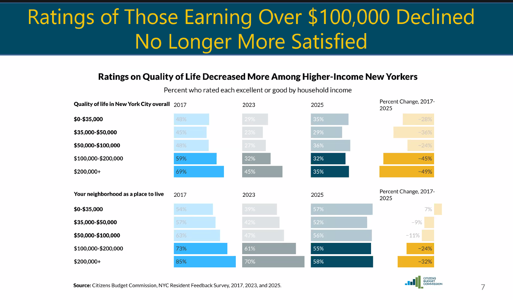People with incomes over $100,000 said their satisfaction shot way down in 2023, putting them at about the same level as everyone else. In 2017, for instance, 69% of people earning more than $200,000 said they were satisfied with the quality of life in the city. This year, that’s down to 35%, the same level as people making less than $35,000 a year; in 2023, that number was still higher, at 45 % satisfaction for higher earners.