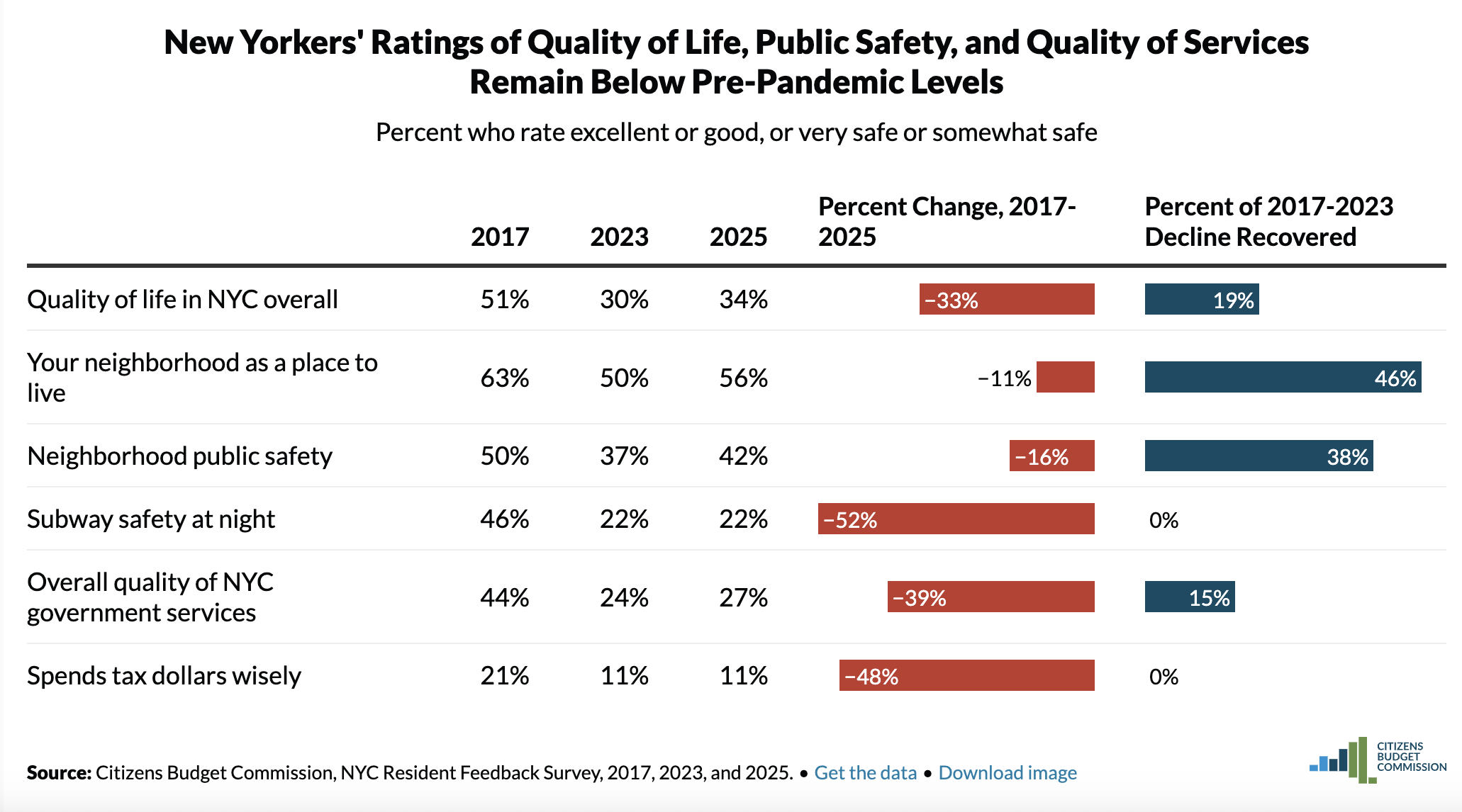 “In most areas we are far below where we were in 2017,” Andrew Rein, president of the Citizens Budget Commission, said in a Zoom announcing the results. “Which means it is harder for New York to attract and keep businesses and residents.”