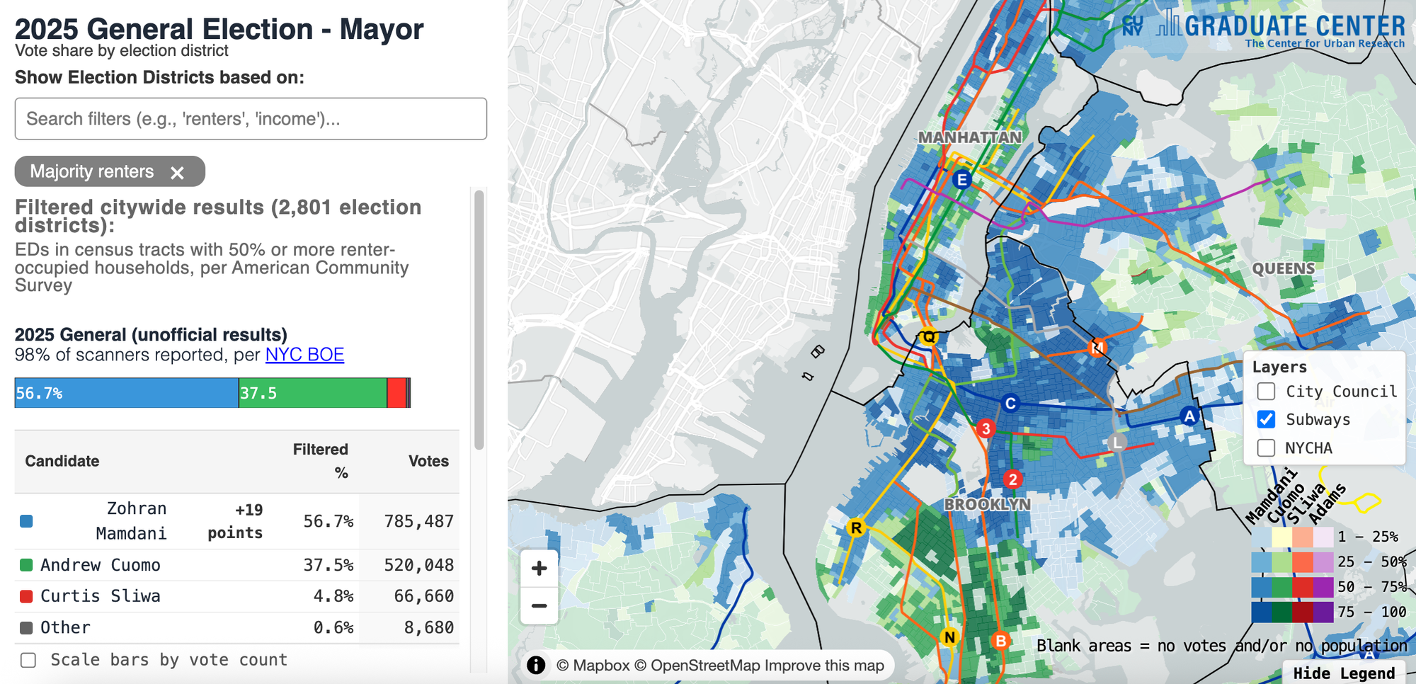 “It follows the subway routes pretty closely,” said Steven Romalewski, director of CUNY Mapping Service for the center. “In those election districts, Mamdani won. He did better than he did overall. Where subways tend not to be, those areas voted for Cuomo.”