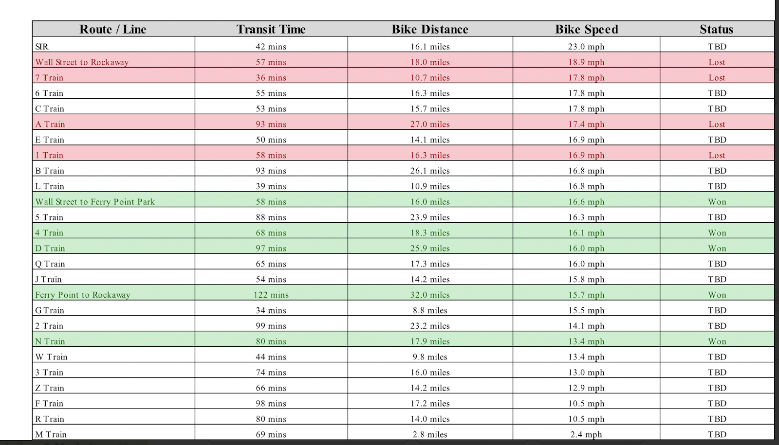 So basically, I pick a subway line and try to beat it to the final stop on my bike. The first one I did was the A train — the longest subway route in the city. I can't remember exactly how many miles the actual line is, but the bike ride was about 30 miles. It goes Inwood to Far Rockaway, this total diagonal through the chaos of the city. I'd been thinking about doing fun endurance and fitness challenges outside the box and racing the train, well I don't know exactly how I came to the idea, but I knew it would be fun.