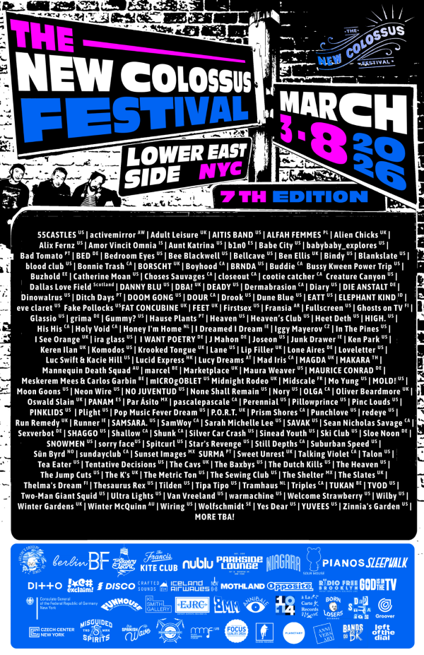 The full New Colossus lineup is online here (and they’ve also got a Spotify playlist of the week’s bands), and Matrick specifically shouted out a Friday night showcase at Pianos featuring a lineup of UK bands including Feet, Lip Filler and Alien Chicks. Thursday night at Parkside Lounge will be “our first actual punk rock party” along with a showcase curated by the blog God Is In The TV. And Saturday night at Pianos includes a lineup of punk bands from the Midwest.