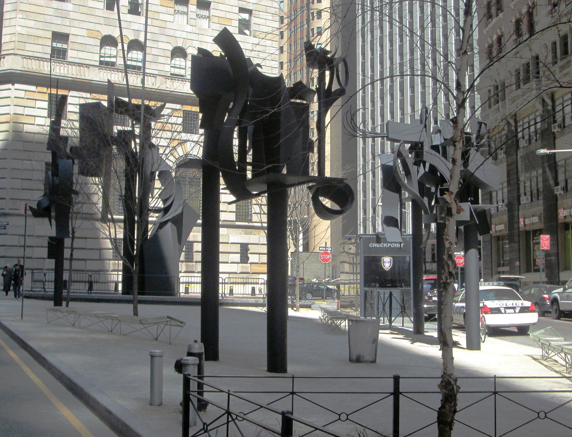 A hallmark touchpoint of her “empire,” as she referred to it, was the Louise Nevelson Plaza. A massive public art installation in lower Manhattan that sits at the intersection of Maiden Lane, Liberty Street and William Street, adjacent to the Federal Reserve Bank of New York. Nevelson created an outdoor environment that displayed seven large-scale metal abstract sculptures, accompanied by seating and flora. In 1978, the Louise Nevelson Plaza was the city's first public space named after and designed by a living artist. The original design remained until changes were made to the park to increase security after 2001’s September 11 attacks, and today a revised design with Nevelson’s seven original works lives on.