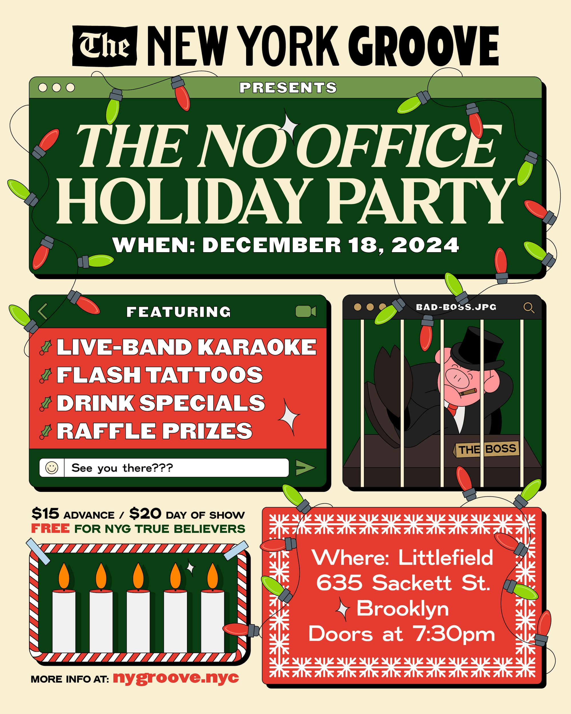 Greetings Groovies, holiday party season is firmly upon us, and that means it's time for The New York Groove's biggest and best annual blowout β The No Office Holiday Party! We're hosting it at Littlefield (635 Sackett Street in Brooklyn) on Dec. 18 with doors at 7:30pm.